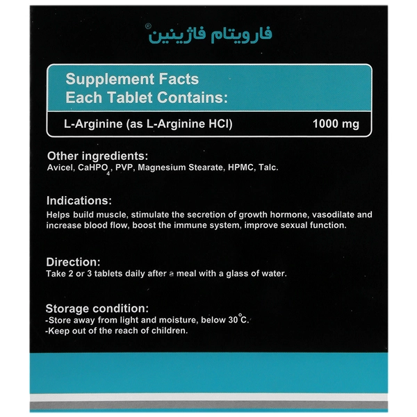• قرص فارویتام فاژینین 1000 میلی‌گرم حاوی 1000 میلی‌گرم ال‌آرژنین (به‌صورت هیدروکلراید) در هر قرص